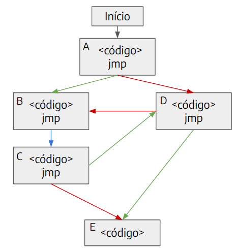 A métrica utilizada pelo AFL++ como feedback da execução de uma entrada é o branch coverage [4]. A imagem abaixo ilustra de maneira simplificada um programa, no qual onde cada bloco é uma sequência linear de instruções e sempre que algum jump ocorre, ou seja, o programa passa a executar outro bloco de código, o qual é representado por uma seta conectando os dois blocos. As setas podem ser azuis, no caso de o programa sempre executar o mesmo bloco de código, ou vermelha e verde, quando o fluxo do programa pode variar, como em uma instrução de comparação que executa diferentes partes do código a depender do resultado obtido.