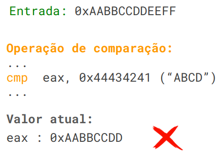 Vamos supor que o fuzzer, inicialmente, envie uma entrada contendo os bytes “0xAABBCCDDEEFF” e monitore o estado do programa ao encontrar operações de comparação: