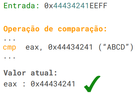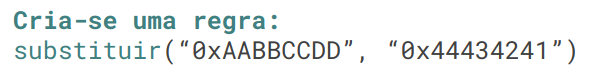 No exemplo acima, o programa compara o conteúdo do registrador “eax” com “0x44434241”, porém, o valor contido no registrador nessa execução é “0xAABBCCDD”. O fuzzer cria uma regra de substituição e troca “0xAABBCCDD” por “0x44434241” na entrada, na esperança de que esse valor do registrador tenha sido lido diretamente da entrada.