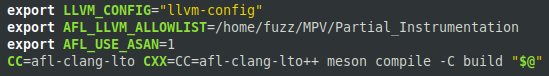 Para realizar a compilação e instrumentação do alvo com o afl-clang-lto foram realizadas algumas mudanças nos arquivos de compilação fornecidos no github do projeto. A imagem abaixo ilustra as alterações em um trecho do script, com a mudança do compilador utilizado e a adição de algumas flags para configuração de recursos do AFL++, como a instrumentação parcial e o ASan.