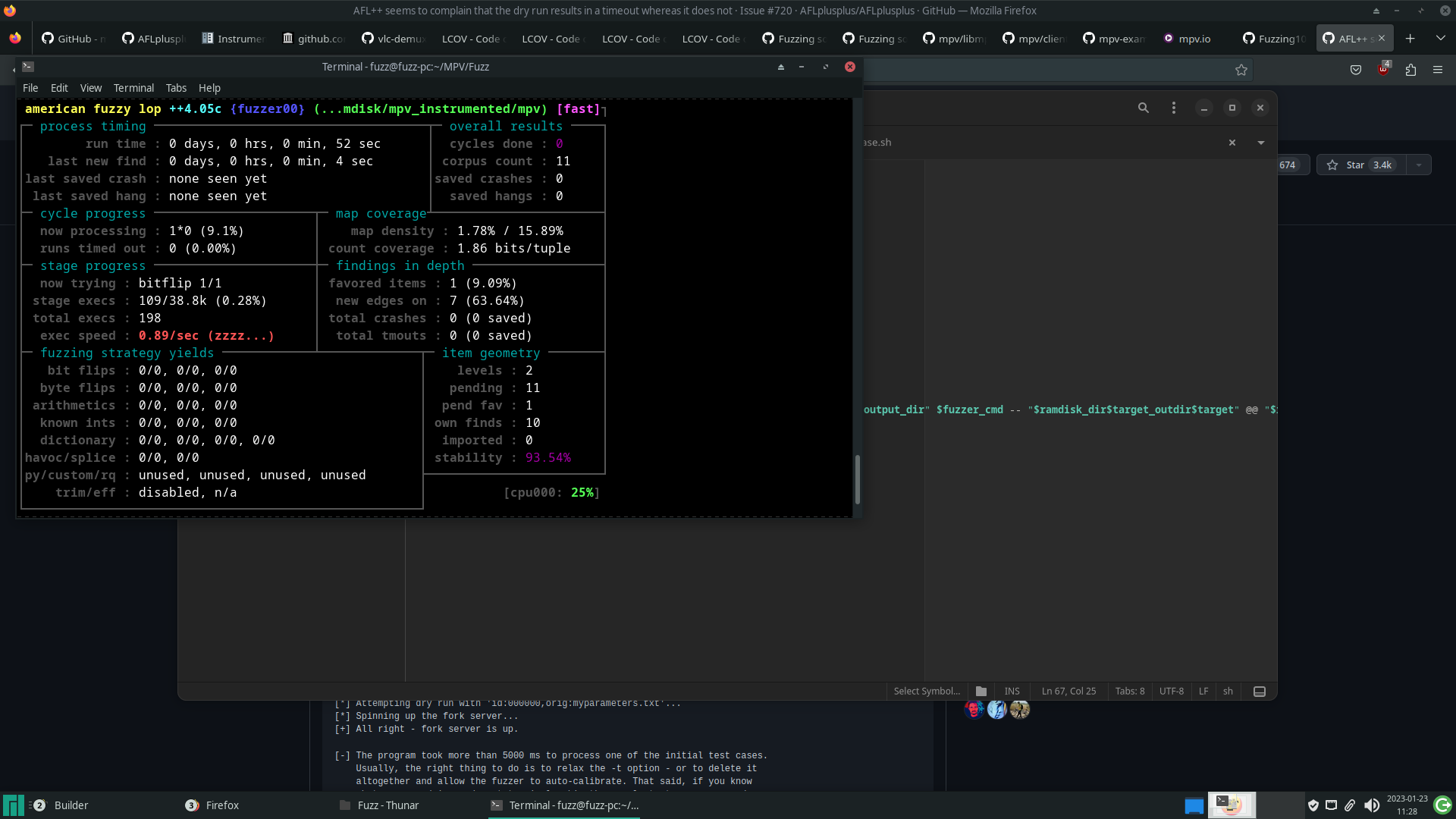 Essa pesquisa com fuzzing foi parte do meu período de estágio na Tempest e, por conta disso, o tempo de execução da campanha foi limitado. Após alguns dias de execução, nenhuma instância do AFL++ havia encontrado algum crash válido e diferentes fatores podem ter gerado esse resultado.