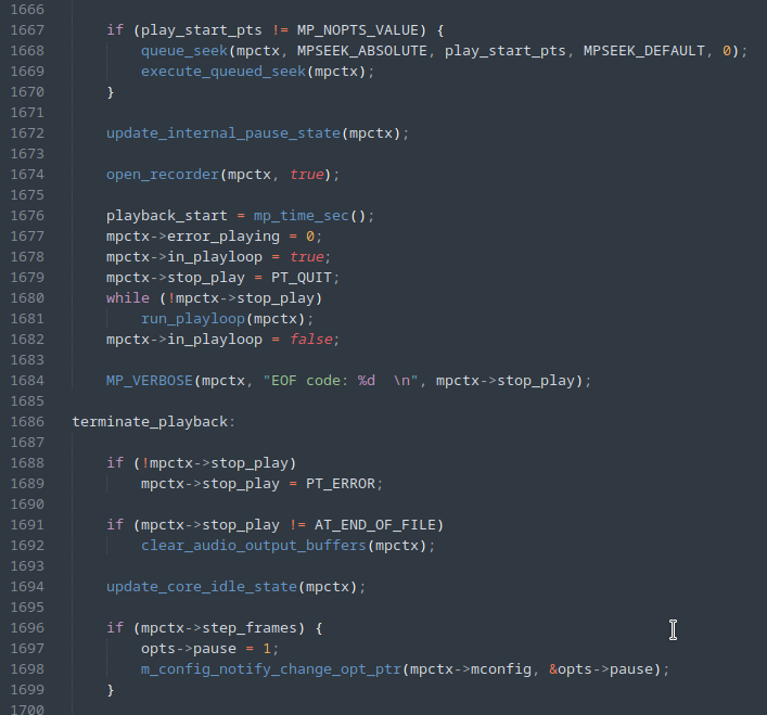Uma primeira tentativa foi alterar o código do MPV para que a execução fosse interrompida logo após a inicialização e os primeiros processamentos terem sido realizados no arquivo de entrada, ilustrado pela figura abaixo, com a adição da linha 1679.