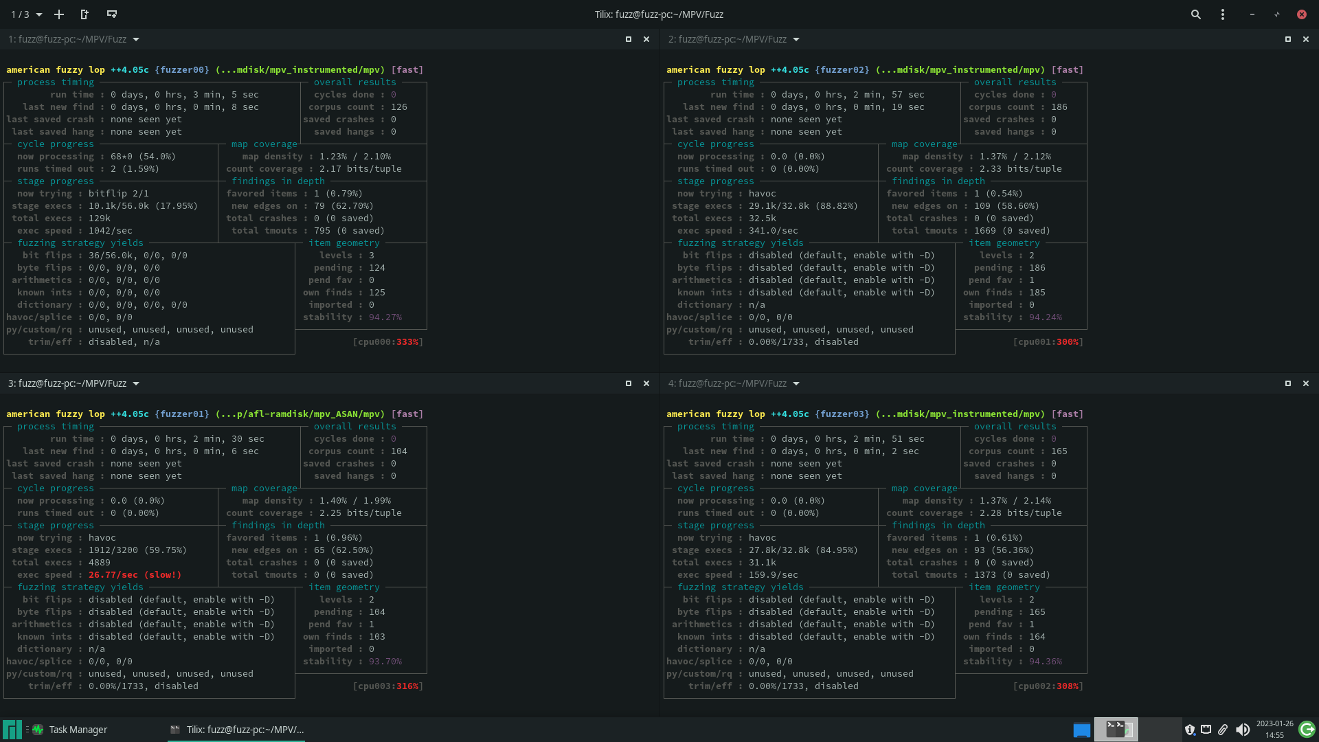 Para cuidar da inicialização de todas as instâncias do AFL++, foi utilizado um script baseado no auto-afl [12]. O script montado auxiliava, ao criar o ramdisk, inicializar todas as instâncias do fuzzer, fazer backups periódicos – vale lembrar que o processo estava em RAM, que é uma memória volátil – e realizar otimizações na fila de casos de teste após longos períodos de campanha.
