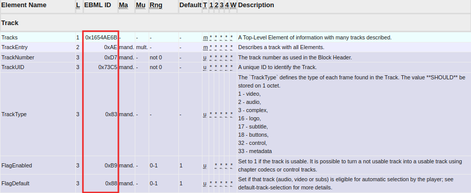 Por fim, foi criado um dicionário contendo as sequências de bytes que possuem significado especial em um arquivo do formato MKV.