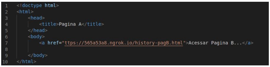 O método history.back() carrega a URL anterior na lista do histórico do navegador — é o mesmo que utilizar o botão “voltar” dos navegadores (o método history.go(-n) é uma segunda forma de fazer isso, sendo n o número de vezes que desejar voltar a página). Outros métodos que precisamos ter conhecimento são o history.replaceState(state, title[, url]), que permite modificar entradas no histórico do navegador, e o history.pushState(state, title[, url]), que registra uma nova entrada no seu histórico de sessão. Sabendo disso, vamos para o exemplo.