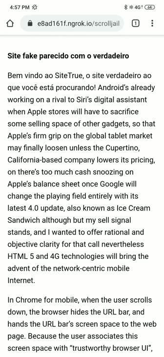 Na grande maioria dos navegadores para celular, quando o usuário realiza um scroll da página, o navegador oculta a barra de URLs. Com isso, um site malicioso com o seu propósito de phishing pode usar esse comportamento para se apresentar como um site diferente, exibindo sua própria barra de URL falsa. Aí você deve estar pensando “Mas quando eu volto para o início da página a barra de URL volta a aparecer!”, porém, ainda assim, depois que o navegador ocultar a barra de URL, podemos mover todo o conteúdo da página para uma “Scroll Jail”, ou seja, um novo elemento com o overflow:scroll. Após isso, o usuário vai achar que está dando o scroll da página, mas na verdade está no Scroll Jail!