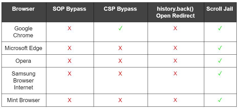 Sabendo disso, o teste realizado foi justamente para verificar se todos os browsers bloqueiam o acesso a recursos cross-origin nesse cenário, e felizmente todos os browsers contidos na pesquisa possuem esse critério.