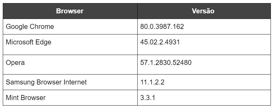 Essa evolução de tecnologias abriu caminho para ótimas experiências aos usuários finais, mas também deu aos agentes maliciosos novos meios, endpoints e vulnerabilidades a serem exploradas em possíveis ataques. A partir disso, neste blog post estaremos tratando especificamente sobre uma análise em cinco navegadores que são utilizados em dispositivos móveis, são eles: Google Chrome, Microsoft Edge, Opera, Samsung Internet Browser e Mint Browser. Para uma melhor visualização do escopo dessa pesquisa, vejamos a tabela a seguir: