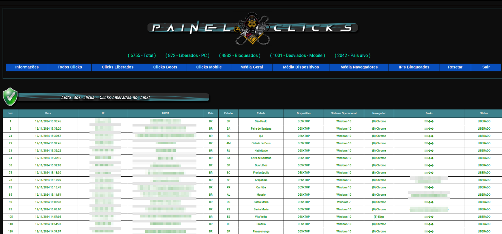 O painel do contador exibe várias informações: quantidade total de acessos, quantidade de acessos por tipo (por sistema operacional e por navegadores), status do controle do acesso (liberado, desviado ou bloqueado) e informações de cada endereço IP que acessou a página maliciosa (data do acesso, host, país, cidade, sistema operacional, e-mail que recebeu a campanha, dentre outras coisas).