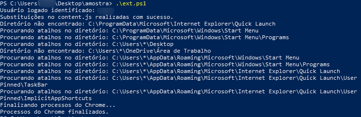 O comando carrega e executa dinamicamente um script chamado “ext.ps1” que baixa e instala a extensão maliciosa do Google Chrome em “C:\temp\content”. A instalação da extensão é bastante ruidosa.