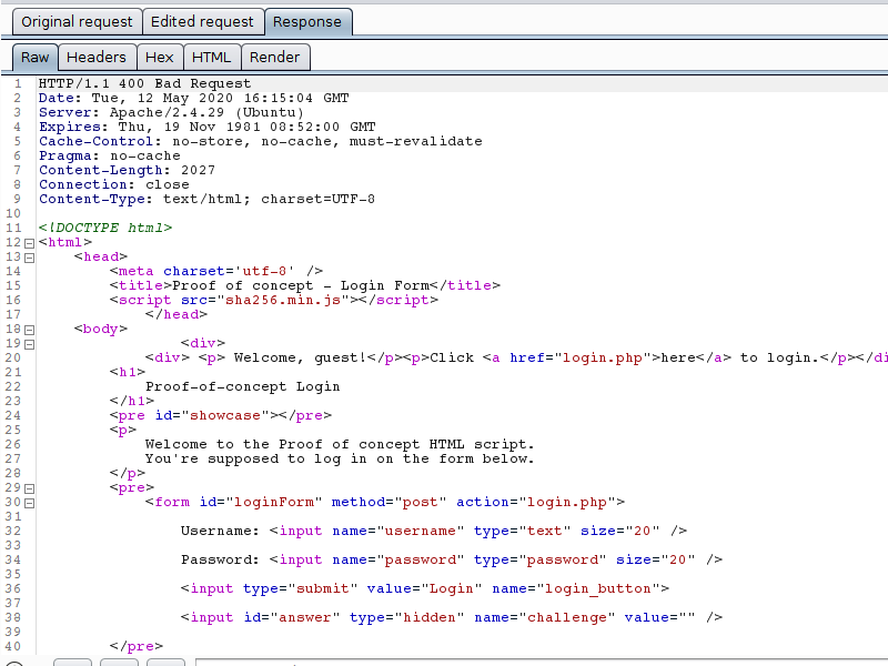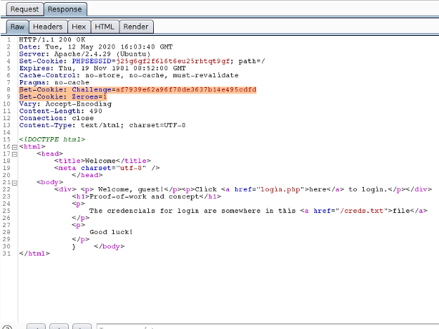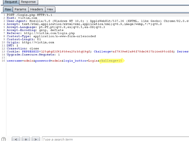 No exemplo a seguir, ao se fazer uma requisição para o site destino, um cookie “Challenge” e um cookie “Zeroes” são servidos ao cliente. Em seguida, ambos os cookies são usados para calcular o valor que é enviado no campo “challenge” do formulário de Login: