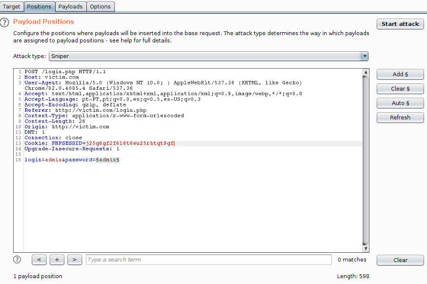 O ataque vertical é, normalmente, o método adotado quando não há restrições para múltiplas tentativas. A imagem a seguir é um exemplo de setup para um Ataque Vertical usando o Burp Intruder: