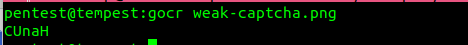 Outra falha comum na implementação do desafio de CAPTCHA é o uso de imagens facilmente reconhecidas por programas de reconhecimento óptico de caracteres, como GOCR e Tesseract. A imagem a seguir, por exemplo, pode ser completamente interpretada por um software de reconhecimento de caracteres: