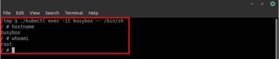 Assim como acessamos o pod Tiller por meio de uma shell interativa utilizando o kubectl, precisamos fazer o mesmo com o busybox (nome do pod malicioso). Basta executar o mesmo comando que foi executado para a shell interativa com Tiller. Porém, neste caso, precisamos apenas executar “./kubectl exec -it busybox – /bin/sh”, como demostrado na imagem: