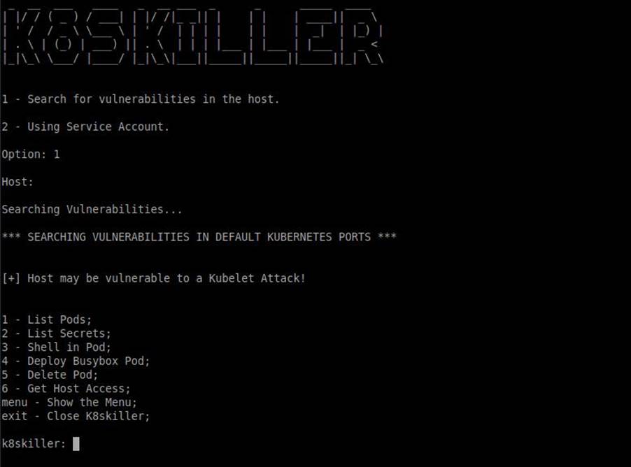 Ela irá verificar se o cluster está vulnerável e caso o resultado seja positivo, o K8skiller irá obter todos os pods, secrets, estabelecer uma forma de deploy dos pods maliciosos assim como sua exclusão após o acesso completo acontecer. Tudo isso é feito apenas selecionando as opções disponibilizadas na ferramenta.