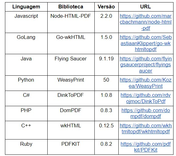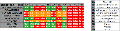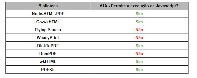 Das 8 bibliotecas testadas, Flying Saucer, WeasyPrint e DomPDF não permitiram a execução de código Javascript; e apenas a biblioteca wkHTML permitiu desabilitar o uso de Javascript.