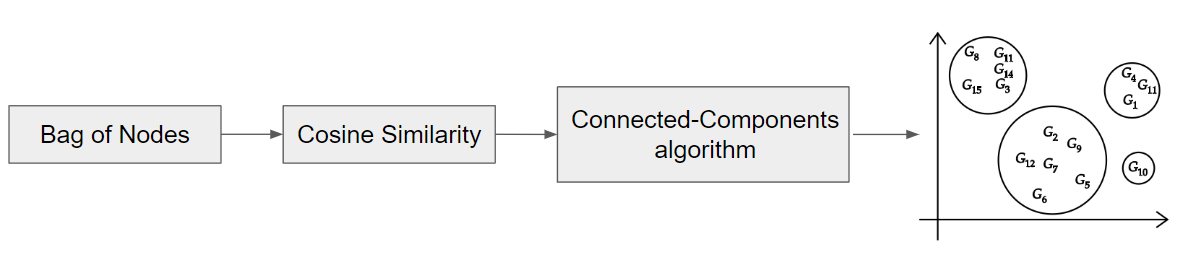 Uma vez que o código está representado na forma de vetores, o FICS realiza uma primeira clusterização agrupando os vetores em clusters de acordo com uma métrica de distância. A métrica de distância utilizada é a medida dos cossenos, também conhecida como cosine similarity, a qual calcula a distância entre os vetores a partir do cosseno do ângulo entre eles. Quanto mais próximo de 1 o resultado for, mais similares são os vetores e vice-versa. Assim, cada par de vetores terá o seu valor de cosine similarity que será fornecido ao algoritmo connected-components, responsável pela formação dos clusters, como demonstrado na figura 11.