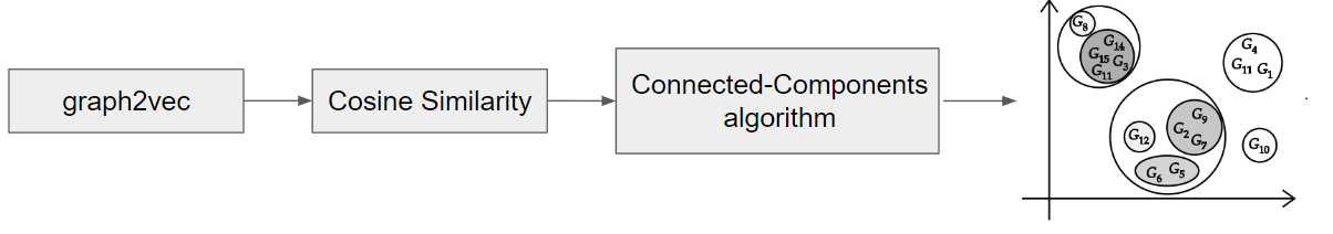 Após a criação dos primeiros clusters, será criado um segundo embedding através da ferramenta graph2vec, que também transforma grafos em vetores, e a cosine similarity é novamente aplicada entre os pares de vetores resultantes do graph2vec a segunda clusterização, com um mais filtro fino, como explicitado na figura 12.