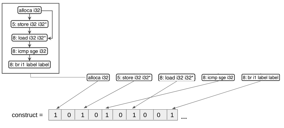 Depois da abstração, o próximo passo é a construção de embeddings para os constructs abstraídos. Embedding se refere às técnicas de transposição de informações de um objeto complexo para um mais simples, em nosso caso, na transformação de uma estrutura de grafos, que possui uma complexidade maior, em vetores, que possui uma complexidade menor. O FICS utiliza o embedding bag of nodes que transforma os grafos dos constructs abstraídos em vetores. Esse processo ocorre de forma que cada operação presente no node, tal como alloca i32, store i32 i32*, load i32 i32*, icmp sge i32 e br i1 label label, são alocadas para um index específico dentro de um vetor, como apresentado na figura 10.