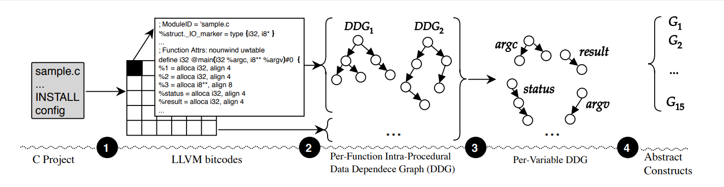 Como apresentado, em sua primeira etapa, o FICS transforma códigos-fonte em representações passíveis de serem clusterizadas. Para isso, realiza quatro ações, como indicadas na Figura 3: i) compilação, ii) extração de data dependence graphs (DDGs) e formação de constructs, iii) abstração de constructs e iv) bag of nodes.