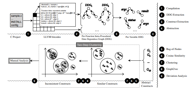 Para analisar e encontrar inconsistências em códigos-fonte, o FICS recebe o código-fonte de um software escrito em C, o transcreve para a linguagem de representação intermediária do compilador Low Level Virtual Machine (LLVM) (BAKSHI, 2022) e o transforma em grafos chamados de “constructs”, que, por sua vez, são vetorizados.