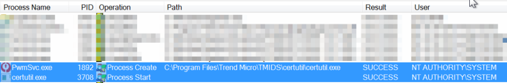 Durante uma análise nas operações realizadas durante a inicialização do sistema operacional, foi possível detectar que o serviço Trend Micro Password Manager Central Control Service, através do seu processo principal PwmSvc.exe, é responsável por criar um novo processo denominado certutil.exe, que tem por finalidade manipular os certificados do navegador Firefox. A imagem seguinte ilustra a criação deste processo:
