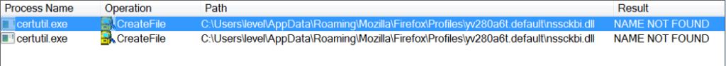 Logo após essa criação, certutil.exe herda as permissões de usuário privilegiado e tenta carregar diversas DLLs, dentre elas, a nssckbi.dll localizada dentro da pasta do perfil do navegador Firefox: