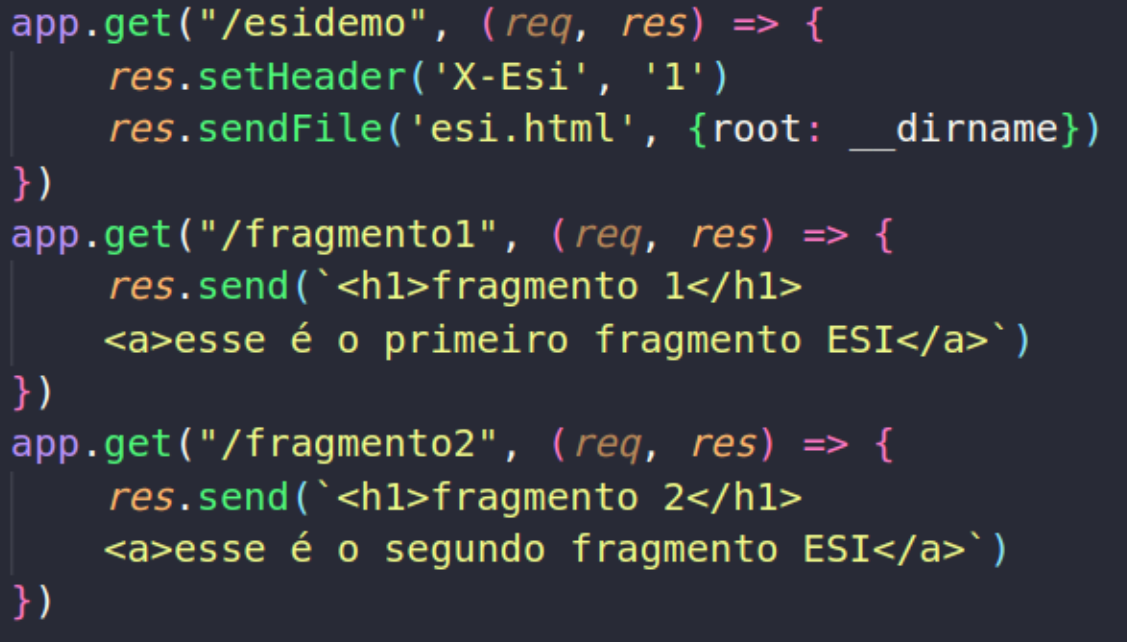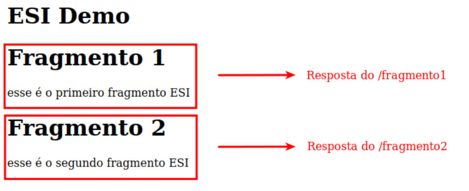 Em resumo, Edge Side Includes é uma ferramenta para otimizar a entrega de conteúdo web, permitindo uma abordagem flexível na construção de páginas por meio da gestão de fragmentos e aproveitando os benefícios dos servidores de cache. Abaixo apresenta-se um exemplo prático em Node.js de uma página construída por meio de fragmentos.