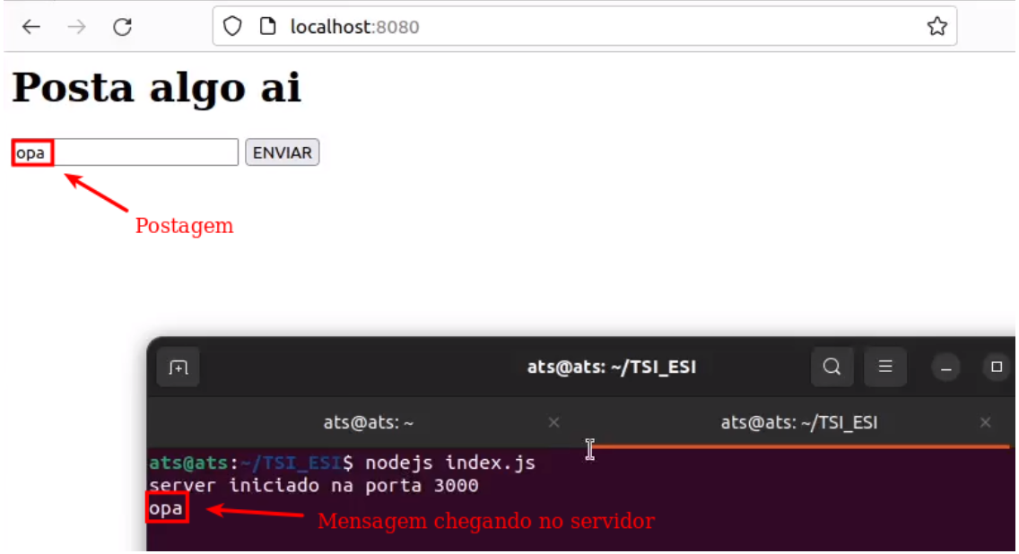 Nesse exemplo, temos uma aplicação de postagens, onde o post realizado na página principal é refletido na página de posts, conforme ilustrado abaixo: