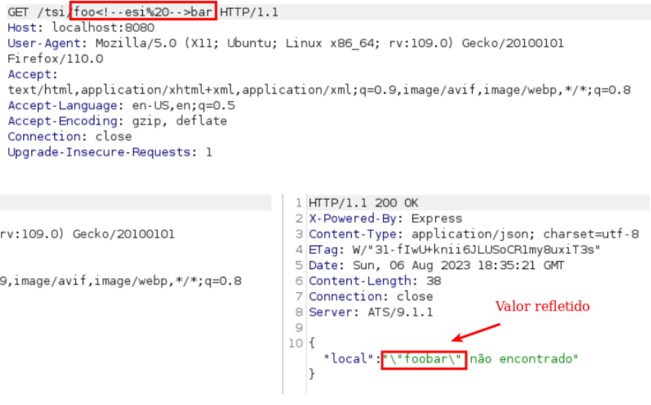 Como é possível observar na segunda imagem, o elemento ESI foi interpretado no servidor de cache, resultando na saída ‘foobar’ para o usuário.