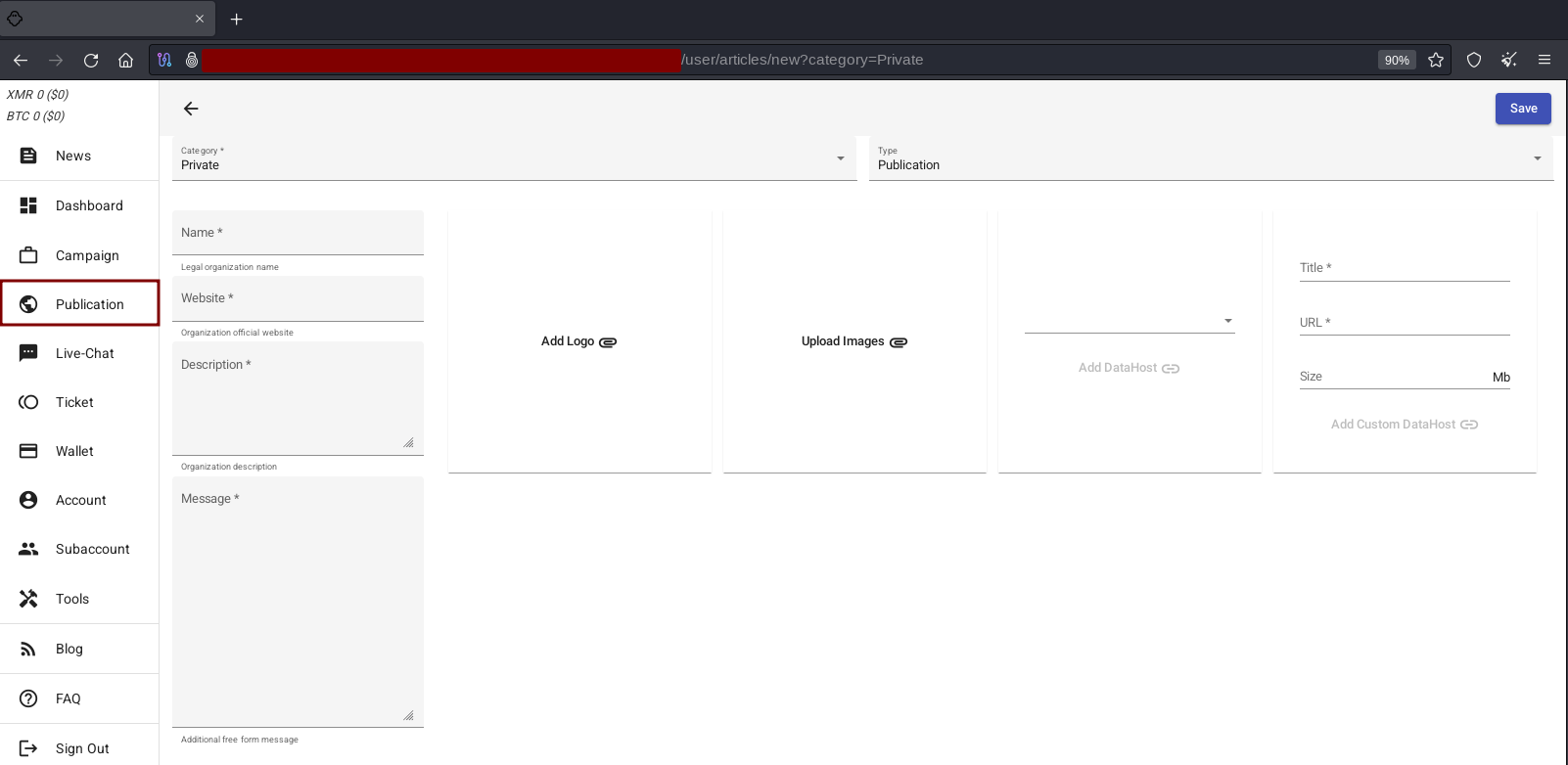 Em Publication -> New Publication o afiliado configura as publicações e dentre as opções e campos disponíveis, observamos o tipo e categoria (Private e Public) e campos relativos a informações de dados vazados (URL e Size).