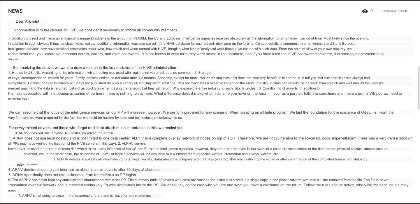 - Janeiro de 2023: após a interrupção da infraestrutura e encerramento do Hive ransomware, operadores do ALPHV realizaram uma publicação orientando seus afiliados a atualizarem suas senhas, carteiras de criptomoedas e informações de contato. Adicionalmente, os operadores comentaram sobre os principais erros do Hive que levaram ao fim de suas atividades, bem como sobre características da infraestrutura e questões organizacionais da operação do ALPHV (imagem abaixo);