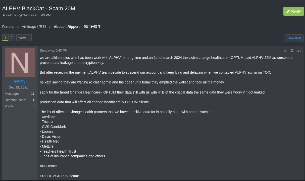 Em 03 de março de 2024, um suposto afiliado do ALPHV identificado como “notchy” publicou informações no fórum RAMP contendo alegações de que o pagamento recebido por extorquir uma de suas vítimas, a empresa norte americana Change Healthcare, teria sido sacado por completo por membros da operação, sem que houvesse a divisão do valor com o afiliado. De acordo com transações da carteira de Bitcoin informada na publicação, em 1° de março os criminosos receberam 350 BTC, o equivalente a aproximadamente, 22 milhões de dólares. Em 3 de março, foram feitas sete transferências de 50 BTC e uma no valor de 0.211148 BTC, deixando assim a carteira vazia.