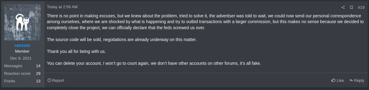 Posteriormente, em 5 de março, o usuário “ransom” utilizado pelo ALPHV anunciou oficialmente, na mesma publicação do fórum RAMP, o fim do projeto, sob a alegação de que a operação policial conduzida pelo FBI e outras entidades impactaram negativamente as atividades do grupo. O operador do grupo também anunciou a venda de seu código fonte, o qual alegou ter uma negociação em andamento.