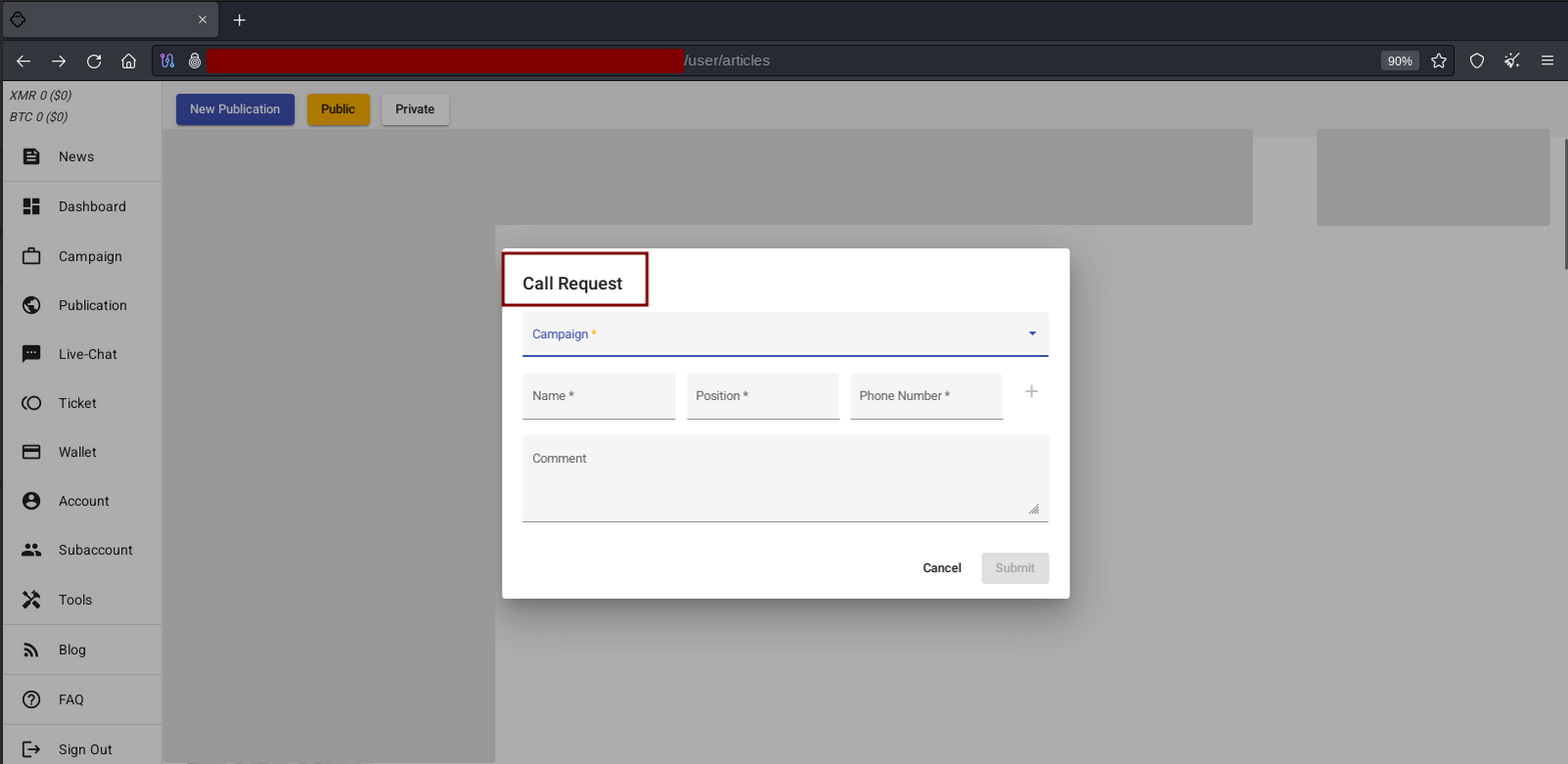 Observamos que a funcionalidade Call Request, a qual permite ao afiliado entrar em contato com a vítima por telefone, é um recurso comum em painéis de outras operações. Contudo, embora não tenhamos testado este recurso, acreditamos que este pode ser um meio utilizado para ameaçar as vítimas, realizar negociações ou mesmo ser utilizado para obter informações de usuários por meio de engenharia social.