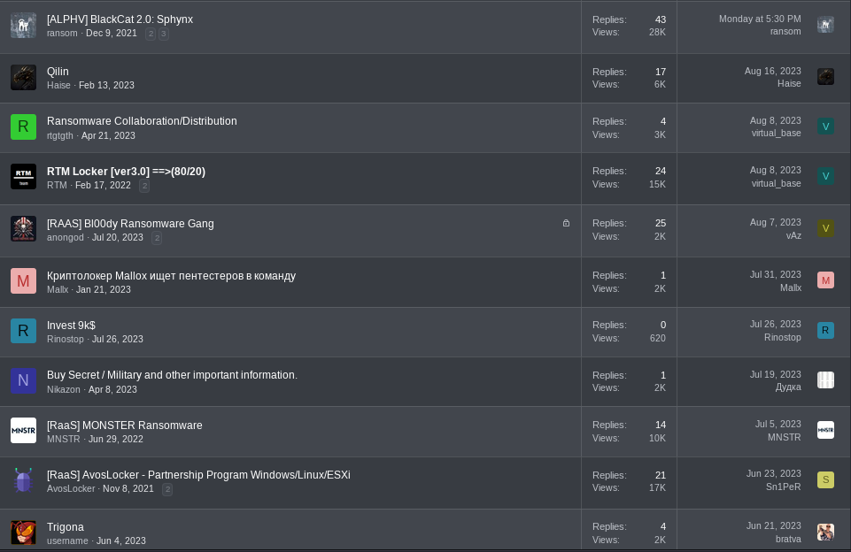 - Dezembro de 2023: operadores reportam problemas na infraestrutura ocasionando a indisponibilidade de servidores. No entanto, o ocorrido estaria relacionado a uma operação policial que permitiu ao FBI obter acesso parcial à infraestrutura do ALPHV. Apesar disso, a operação continua ativa.