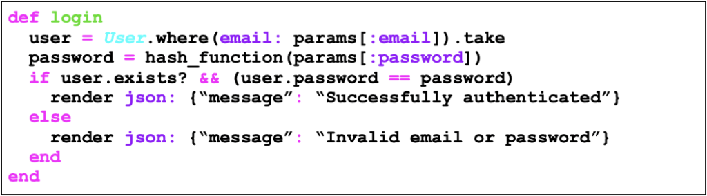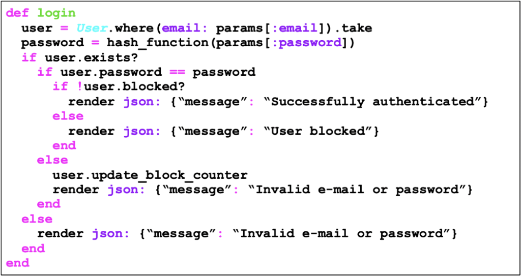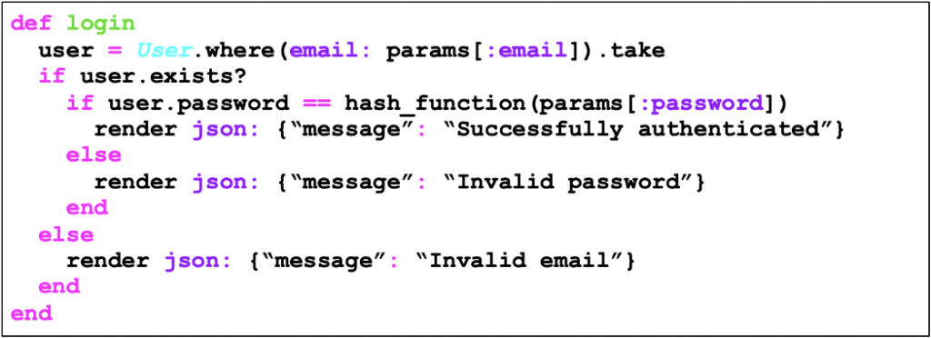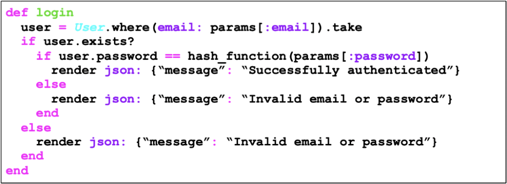 O código abaixo é vulnerável à enumeração de usuários através da distinção entre mensagens de erro, nas quais, caso o login (neste caso o login é o email) fornecido esteja correto e a senha errada, a mensagem de erro “Invalid password” é exibida, e caso o login esteja errado a mensagem exibida é “invalid email”.