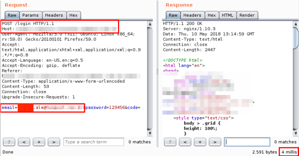 Como exemplo, nós pegamos um caso que encontramos durante um pentest realizado aqui na Tempest (nota: a vulnerabilidade já foi corrigida e os dados foram anonimizados). Repare na imagem abaixo que o tempo de resposta para a requisição, quando submetido um usuário válido, foi de 1211 milissegundos: