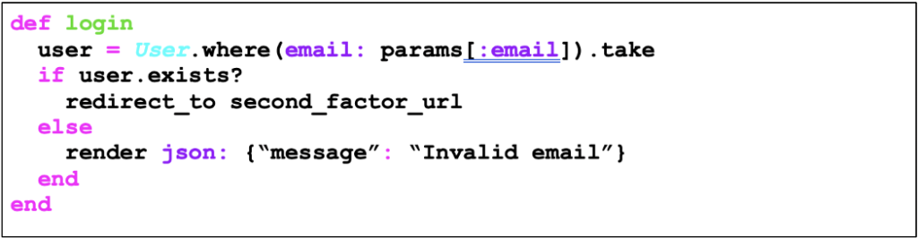 Este talvez seja o caso menos comum dentre os aqui demonstrados e só ocorre em aplicações que utilizam uma abordagem de múltiplos passos para realizar a autenticação. O exemplo mais comum é quando a aplicação, após receber um login válido, solicita que o usuário apresente o segundo fator de autenticação. Caso o usuário forneça um login inválido, a aplicação exibe uma mensagem de erro qualquer. Trivial seria imaginar como realizar a enumeração de usuários nesse caso. Como seria mais ou menos um código vulnerável?
