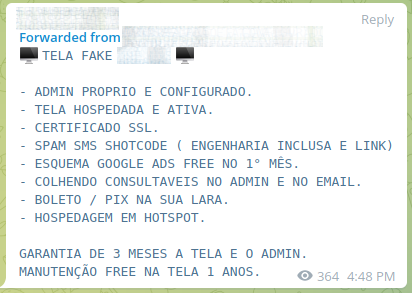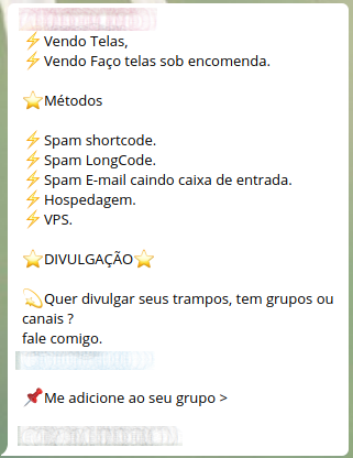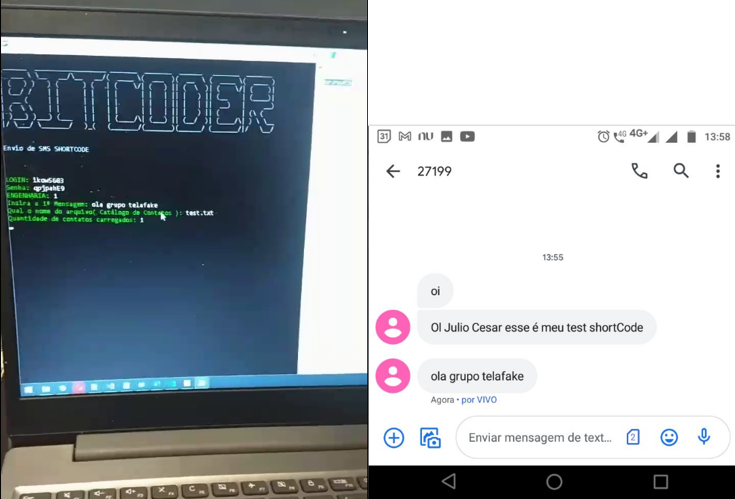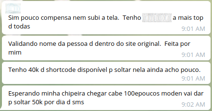 Em um grupo de chat privado focado em fake stores, identificamos conversas sobre o uso criminoso de short code, incluindo um vídeo que demonstra o funcionamento de um script de envio em massa desenvolvido por um dos membros do grupo. A ferramenta utiliza a API de um serviço legítimo de SMS marketing para disparar as mensagens.