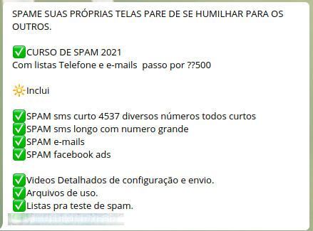 Além da comercialização de ferramentas e serviços de SPAM, em alguns chats também é possível identificar a venda de cursos para aspirantes a criminosos, conforme o exemplo a seguir. O anúncio é sobre um “curso de SPAM”, cujo tópicos incluem o uso do serviço Facebook Ads, para disseminar campanhas maliciosas por meio de anúncios maliciosos nas redes sociais.