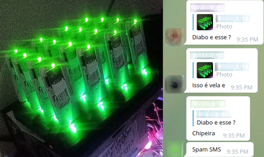 Outro mecanismo encontrado em grupos de fraudes é a chipeira, uma espécie de “fazenda” de modems conectados que realizam o envio em massa de mensagens SMS. Para montar essa infraestrutura, os criminosos compram vários chips pré-pagos com suporte ao envio ilimitado de SMS. As mensagens são enviadas para uma lista pré-definida de números com o auxílio de um software gerenciador de mensagens de texto, como o SMS Caster. Para o correto funcionamento da chipeira, é necessário que o usuário configure o número do remetente, que pode ser no formato short ou long code.