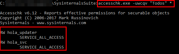Quando instalado em sistemas Windows, as permissões padrão do Hola VPN permitem que usuários sem privilégios modifiquem ou substituam os processos, hola_svc e hola_updater, os quais são responsáveis pelo software de VPN. A imagem a seguir mostra os dois processos com a flag SERVICE_ALL_ACCESS, a qual comprova a parametrização incorreta nas permissões do Hola VPN.