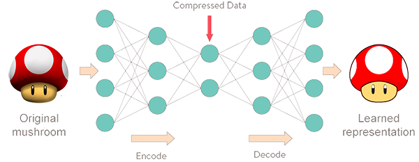 Por outro lado, a parte decodificadora do autoencoder faz a tarefa oposta. Ela reconstrói os dados de entrada originais a partir de sua representação comprimida. Assim, o autoencoder codifica padrões de dados em representações de menor dimensão e depois os reconstrói para que tenham as mesmas dimensões das entradas originais e pareçam o máximo possível com elas [5]-[7]. Entretanto, como se pode esperar, pode haver alguma diferença entre os dados de entrada originais e suas reconstruções, essas diferenças são chamadas de erros de reconstrução [7]-[9]. A Figura 1 ilustra a estrutura de um autoencoder que codifica e decodifica imagens de cogumelos.