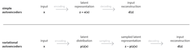 Existem também variações na estrutura dos autoencoders que os melhoram de diferentes maneiras. Dentre elas, os variational autoencoders (VAE) melhoram os autoencoders através da modelagem de dados com distribuições estatísticas. Enquanto autoencoders tradicionais constroem uma representação fixa de amostras de dados que os mapeia em versões com dimensões reduzidas de si, VAEs modelam o espaço de dimensões reduzidas de acordo com uma distribuição estatística com média μ e desvio padrão σ [5], [12], [13]. Ou seja, ao invés de simplesmente mapear amostras de dados em padrões comprimidos com o codificador do autoencoder, o VAE encontra qual distribuição de dados pode representar todos os dados comprimidos. Esta propriedade nos permite obter vetores aleatórios dessa distribuição, independentemente de qual entrada os produziria, e usar o decodificador do VAE para produzir novas amostras de dados. Assim, o VAE não só reconstrói amostras de dados, como também tem a capacidade de gerar novas amostras [5], [12], [13].