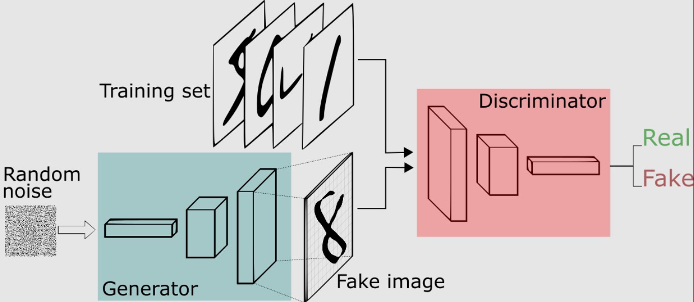 Ao invés de ser uma única rede neural, as GANs são uma estrutura que consiste em duas redes neurais: gerador e discriminador. Estas redes têm objetivos diferentes e competem entre si em um processo de treinamento adversarial, de modo que quando uma delas melhora, a outra deve melhorar e acompanhar o ritmo. É como se fossem dois jogadores de xadrez e, quando um deles começa a ganhar, o outro treina um pouco mais para reverter o placar. Como resultado, ambos os jogadores acabam melhorando seu desempenho e alcançando melhores resultados [1]-[3].